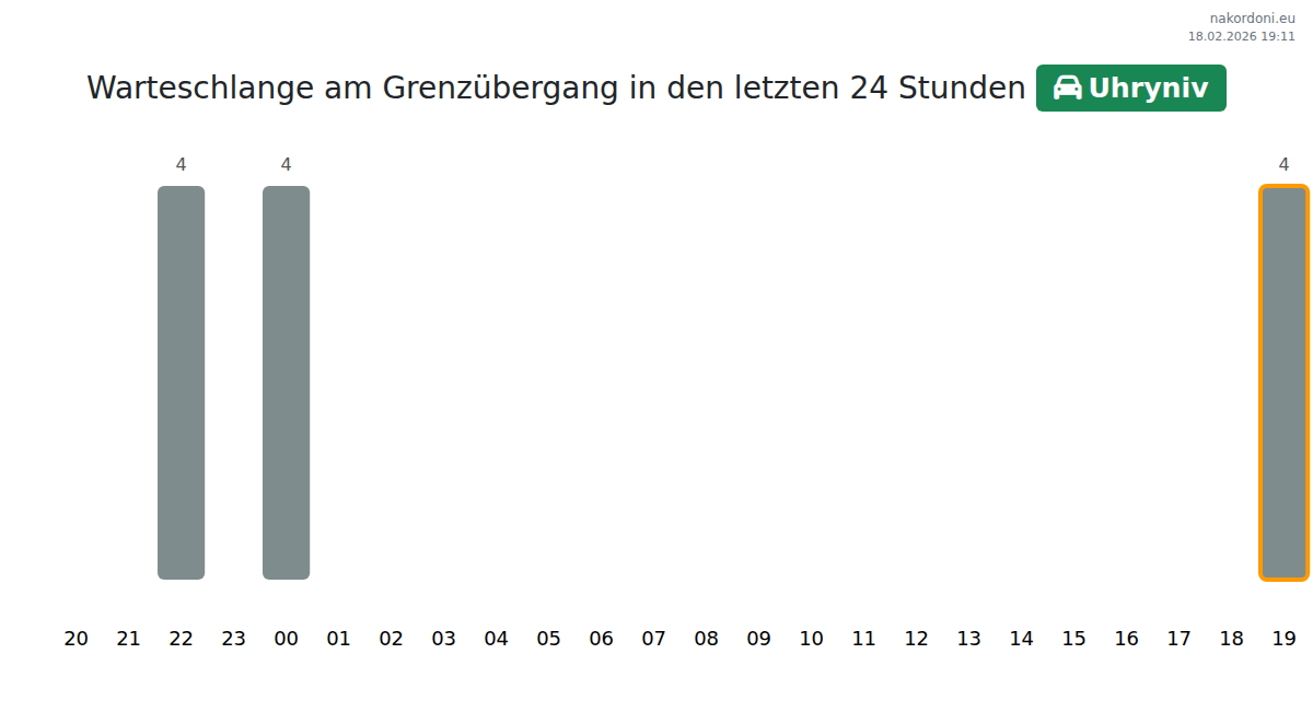 Am Kontrollpunkt Uhryniv beträgt die Wartezeit für Pkw 15-75 Minuten, durchschnittlich 34 Minuten. Vermeiden Sie Stoßzeiten um 19:00, 10:00 und 14:00 Uhr. Für kürzere Wartezeiten wählen Sie 15:00, 18:00 oder 21:00 Uhr.