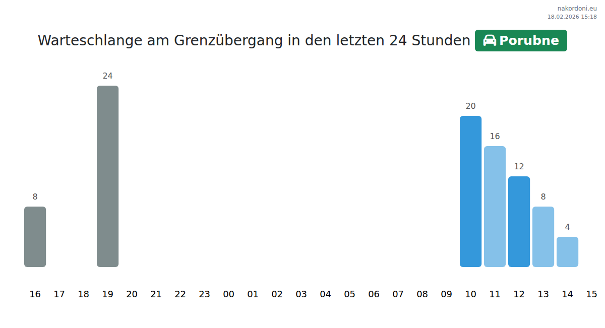 Am Grenzübergang Porubne Wartezeiten für Pkw: 15-717 Min. Meiden Sie Stoßzeiten: 08:00, 17:00, 03:00 Uhr. Beste Überfahrtszeiten: 15:00, 18:00, 21:00 Uhr.
