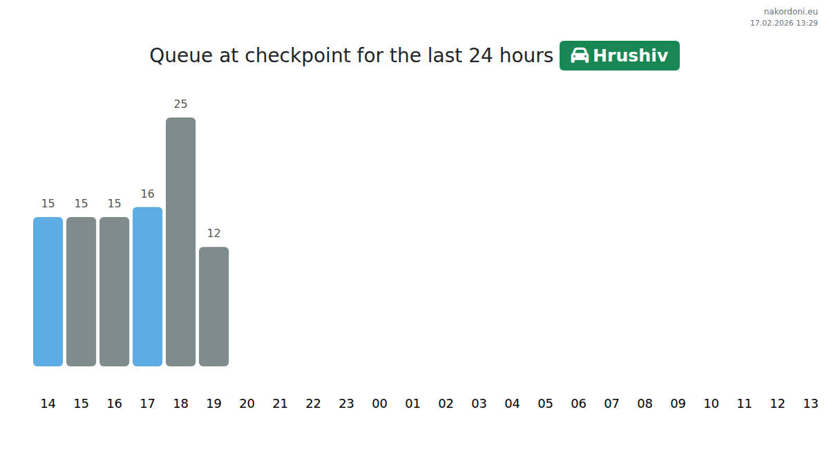 At Hrushiv, expect wait times between 15-3535 minutes. To avoid the longest queues, steer clear of 05:00, 03:00, and 01:00. The best times to cross Hrushiv are 15:00, 18:00, and 20:00.