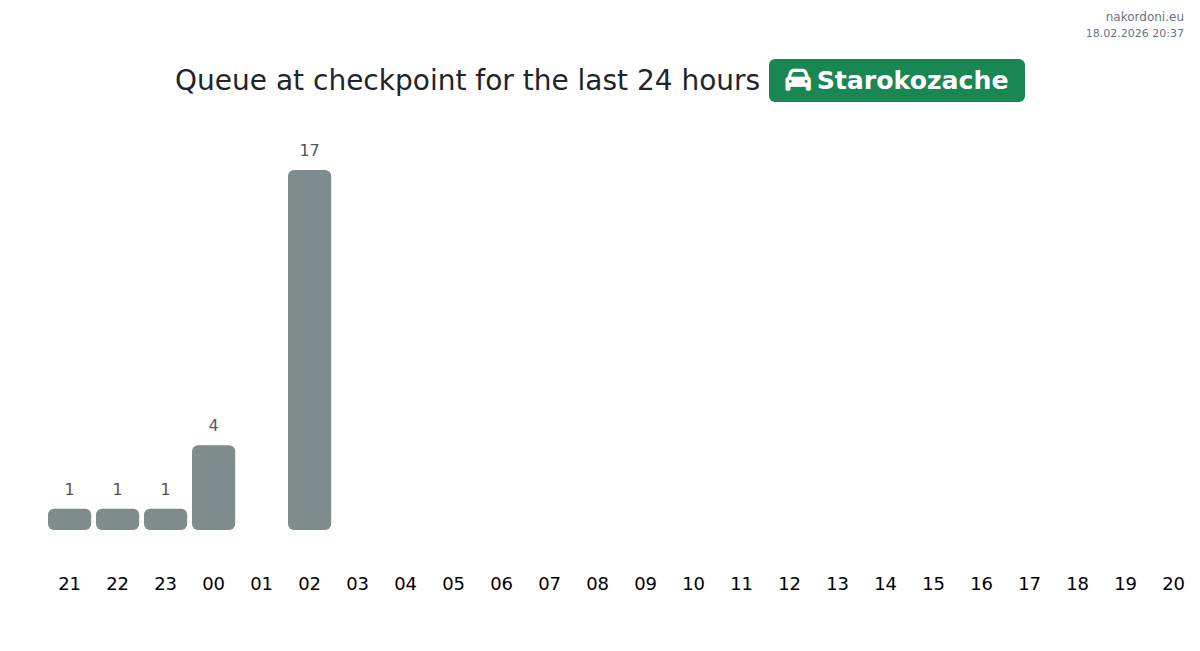 At Starokozache, wait times for passenger cars range from 15 to 265 minutes. Avoid crossing during peak hours at 15:00, 17:00, and 00:00. The shortest queues are expected around 23:00, 01:00, and 02:00.
