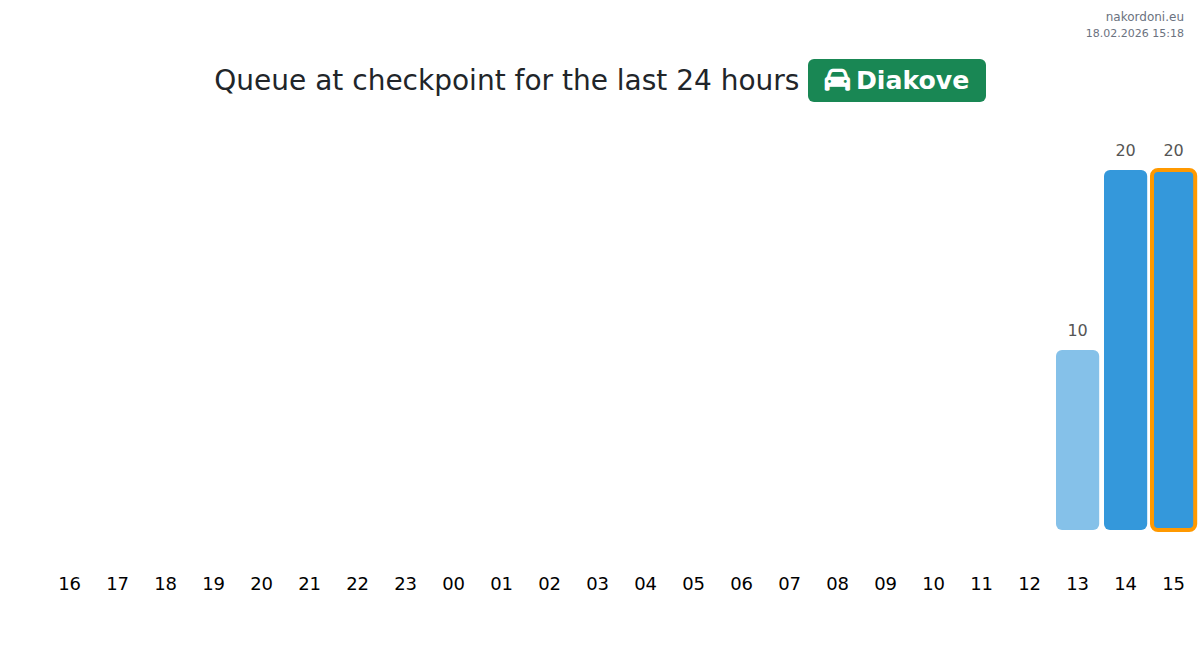 At the Diakove checkpoint, wait times range from 15 to 63 minutes. Peak hours to avoid are 08:00, 13:00, and 02:00; for a faster crossing, the best times are 10:00, 12:00, and 14:00.