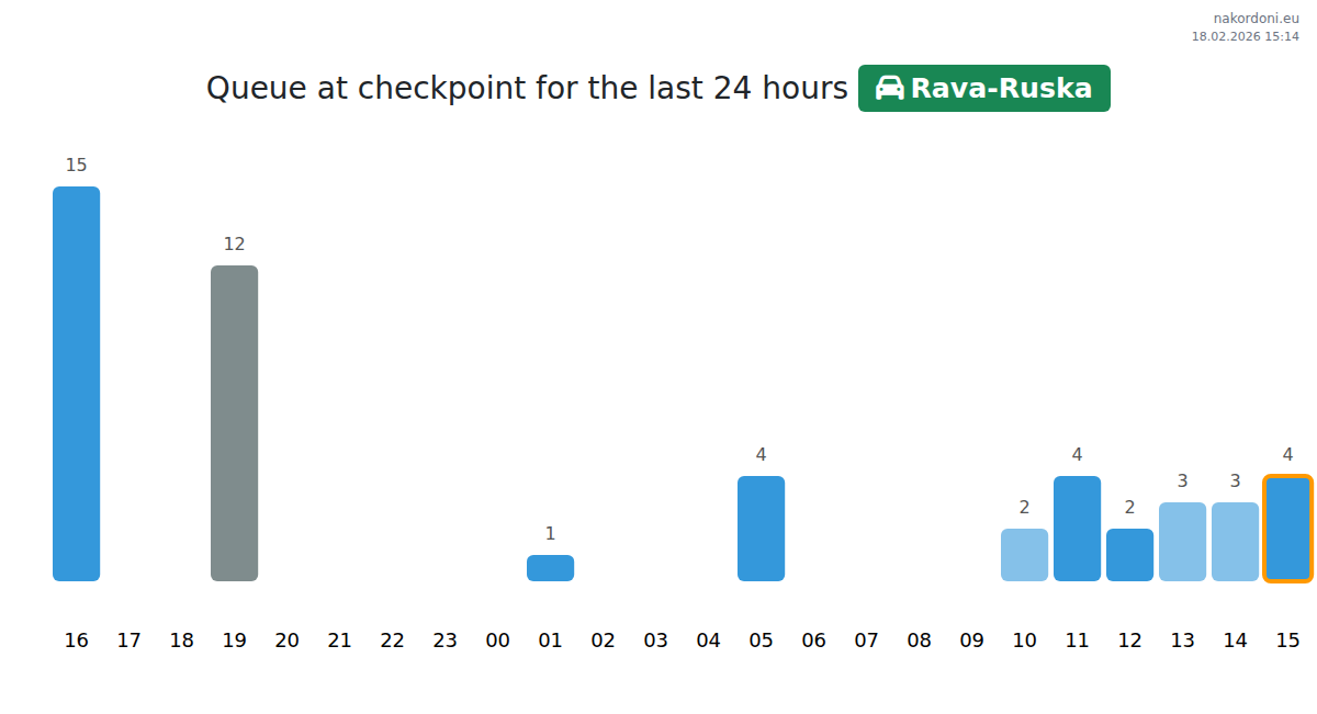 At Rava-Ruska for passenger cars, expect wait times between 15-75 minutes. Avoid crossing during peak hours at 16:00, 14:00, and 17:00. The shortest queues are typically observed at 09:00, 12:00, and 15:00.