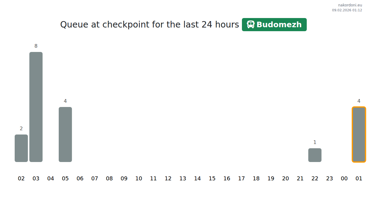 At Budomezh, bus wait times are estimated to range from 15 to 2335 minutes. To avoid long queues, steer clear of peak hours: 14:00, 13:00, and 15:00. The best times to cross for shorter waits are 17:00, 06:00, and 20:00.