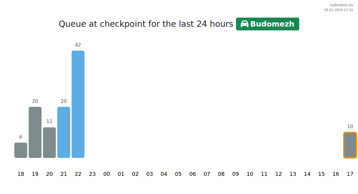 At Budomezh, wait times for passenger cars range from 15 to 2415 minutes. To avoid long queues, it is advisable to bypass peak hours at 21:00, 01:00, and 20:00. The shortest queues are expected around 02:00, 06:00, and 09:00.
