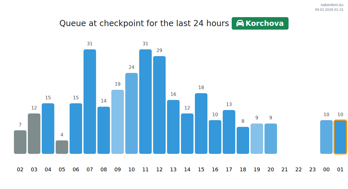 Plan your trips in advance using up-to-date border queue information at the Korchova - passenger car checkpoint to make your crossing fast and convenient. Pay special attention to these hours to avoid peak times and reduce waiting times.
