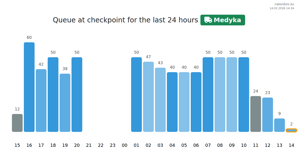 At Medyka, vehicle wait times are currently estimated between 15-159 minutes. To avoid longer queues, it's advisable to steer clear of peak times around 08:00, 14:00, and 20:00. For the shortest waits, consider crossing between 11:00 and 13:00.