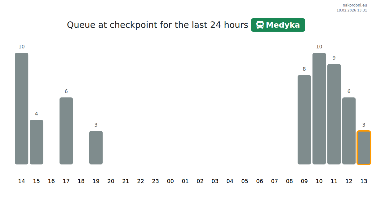 At Medyka, bus wait times range from 95 to 975 minutes. Avoid peak hours like 06:00, 10:00, and 00:00. For shorter queues, consider crossing at 15:00, 20:00, or 09:00.