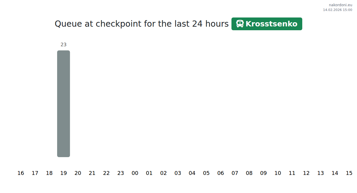 At Krosstsenko checkpoint, bus queues are estimated to be 15-15 minutes. Avoid peak hours (08:00-10:00). For shorter waits, cross between 11:00 and 13:00.
