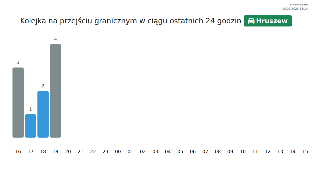 W Hruszew, spodziewaj się czasów oczekiwania od 15 do 57 minut. Unikaj godzin szczytu około 08:00, 11:00 i 10:00. Najlepsze czasy na przejazd z krótszymi kolejkami to 15:00, 18:00 i 21:00.