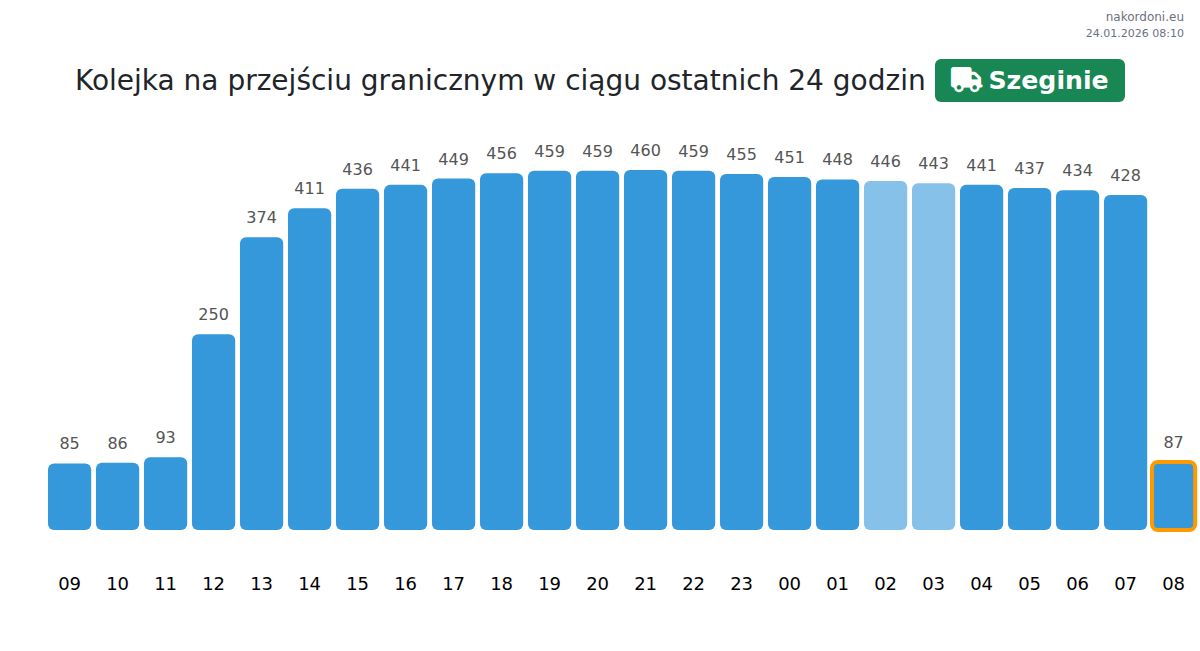 Na przejściu granicznym Szeginie szacowany czas oczekiwania dla pojazdów wynosi od 15 do 939 minut. Unikaj godzin szczytu między 11:00 a 13:00, aby szybciej przekroczyć granicę. Najlepsze godziny na przejazd to zazwyczaj 02:00, 03:00 lub 06:00.