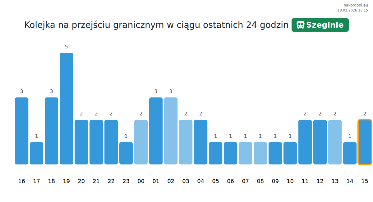 Na przejściu granicznym Szeginie szacowany czas oczekiwania dla autobusów wynosi 15-175 minut. Unikaj godzin szczytu o 10:00, 11:00 i 13:00. Dla krótszych kolejek rozważ przekroczenie granicy o 05:00, 09:00 lub 14:00.