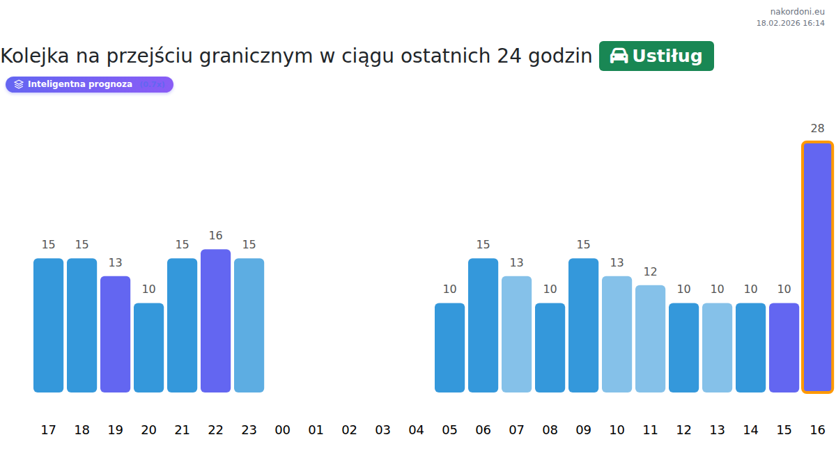 Na Ustiługu, samochody osobowe mogą spodziewać się czasu oczekiwania 35-67 minut. Unikaj godzin szczytu o 17:00, 18:00 i 20:00. Najlepsze godziny na przejazd to 23:00, 03:00 i 05:00.