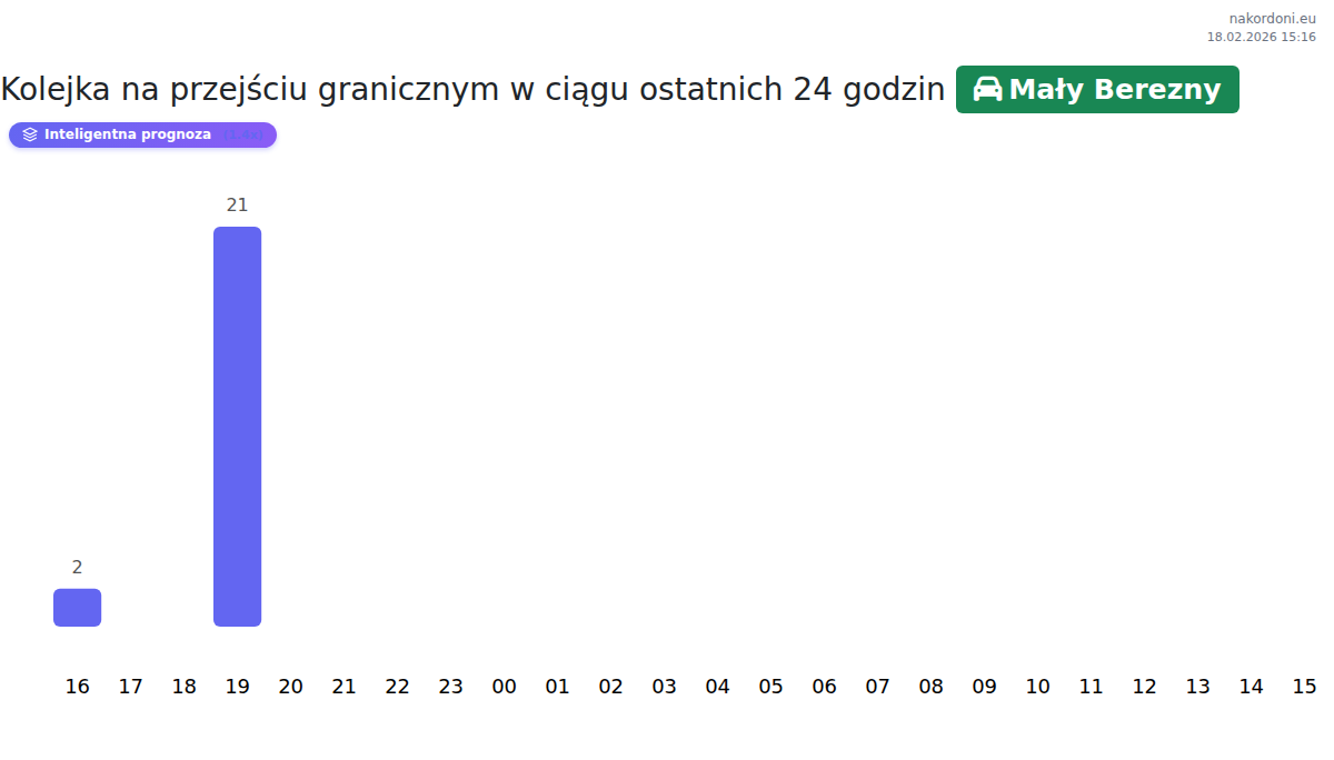 Na przejściu Mały Berezny spodziewaj się czasu oczekiwania od 15 do 111 minut. Unikaj godzin szczytu o 11:00, 01:00 i 17:00. Aby uniknąć kolejek, przekraczaj granicę o 15:00, 18:00 lub 21:00.