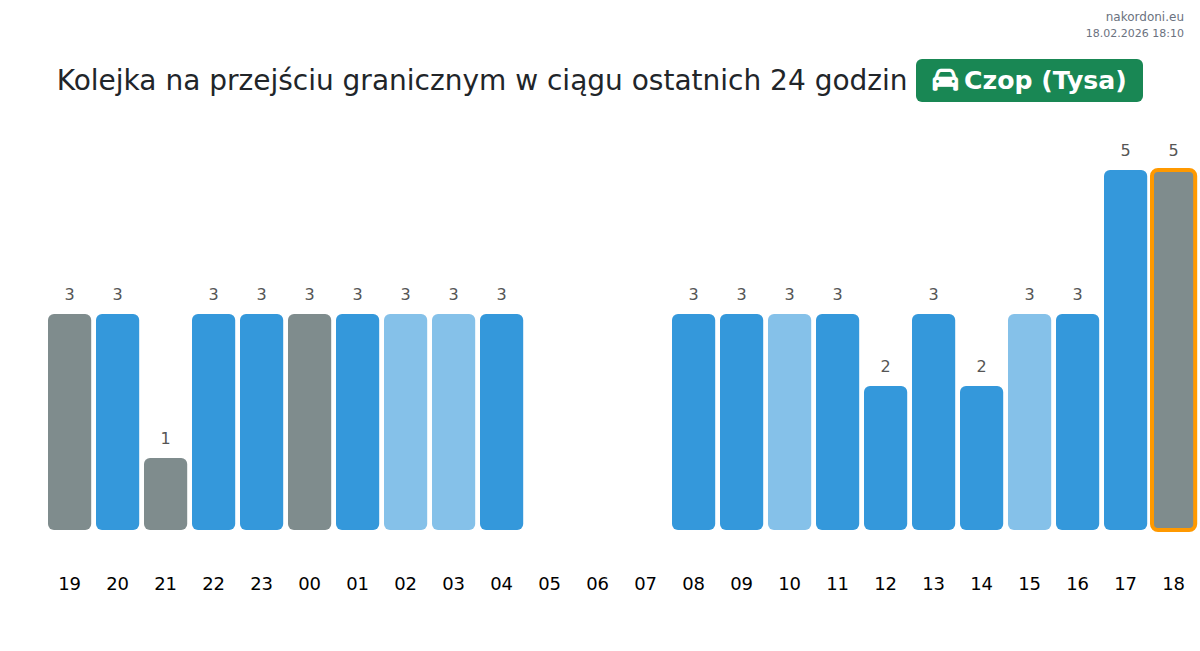 Dla Czop (Tysa) przewidywany czas oczekiwania wynosi od 15 do 291 minut. Unikaj godzin szczytu o 01:00, 02:00 i 14:00. Najlepsze godziny na przekroczenie to 23:00, 03:00 lub 04:00, aby uniknąć dłuższych kolejek.