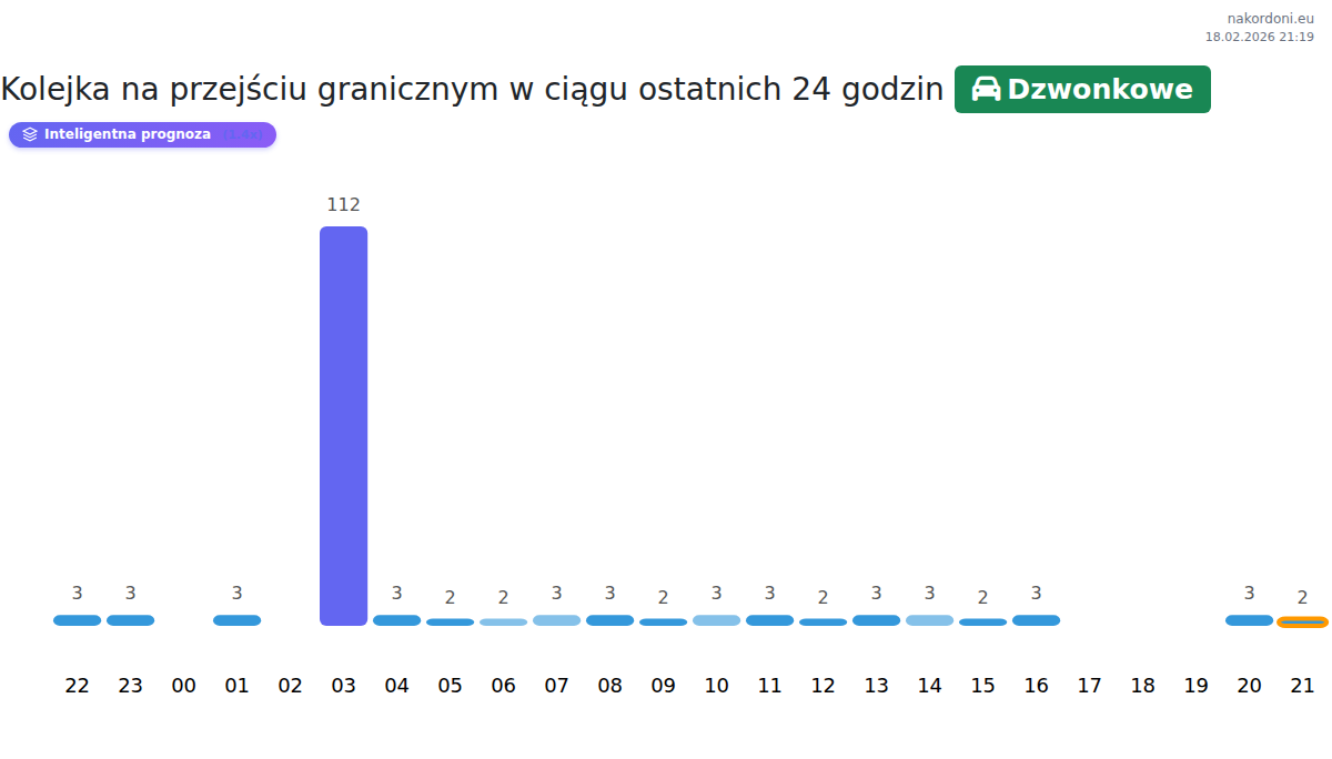 Przewidywany czas oczekiwania na przejściu Dzwonkowe dla samochodów osobowych wynosi od 15 do 609 minut. Unikaj godzin szczytu o 04:00, 20:00 i 01:00. Najlepszy czas na przekroczenie granicy to godziny 09:00, 10:00 lub 12:00.
