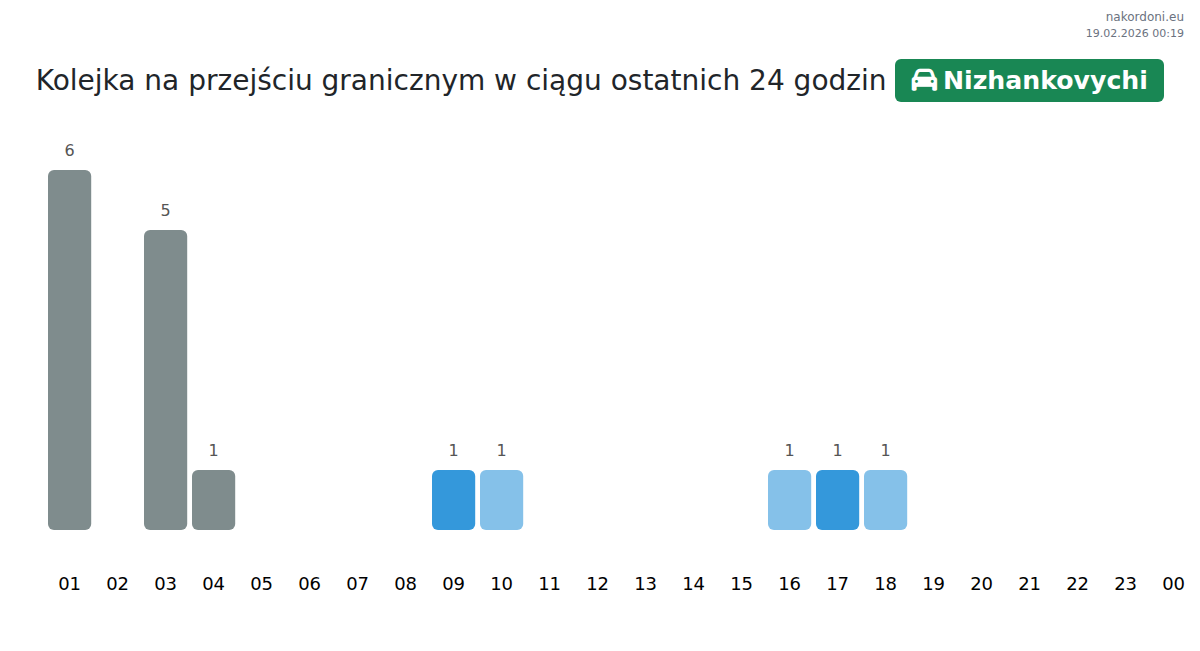 Na przejściu granicznym Nizhankovychi, dla samochodów osobowych, przewidywany czas oczekiwania to 15-85 minut. Unikaj przekraczania w godzinach szczytu: 08:00, 01:00, 23:00. Najkrótsze kolejki są zazwyczaj o 15:00, 18:00, 21:00.