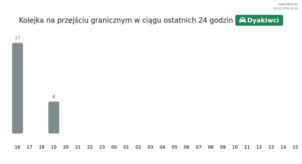 Przewidywany czas oczekiwania na przejściu Dyakiwci wynosi od 15 do 123 minut. Godziny szczytu to 08:00, 11:00 i 14:00, natomiast najlepszy czas na sprawne przekroczenie granicy to 10:00, 12:00 lub 13:00.