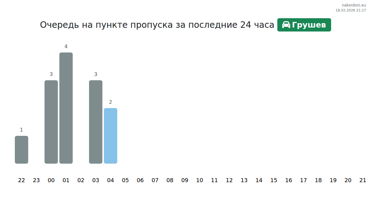 На Грушеве ожидайте время ожидания от 15 до 57 минут. Избегайте часов пик около 08:00, 11:00 и 10:00. Лучшее время для пересечения с меньшими очередями – 15:00, 18:00 и 21:00.