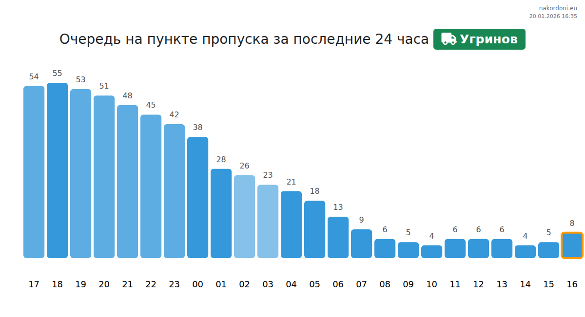 На пункте пропуска Угринов прогнозируемое время ожидания для транспортных средств составляет от 15 до 5535 минут. Рекомендуется избегать пересечения в 09:00, 01:00 и 00:00, так как это часы пиковой нагрузки. Для минимальных очередей лучшее время для пересечения – с 02:00 до 04:00.