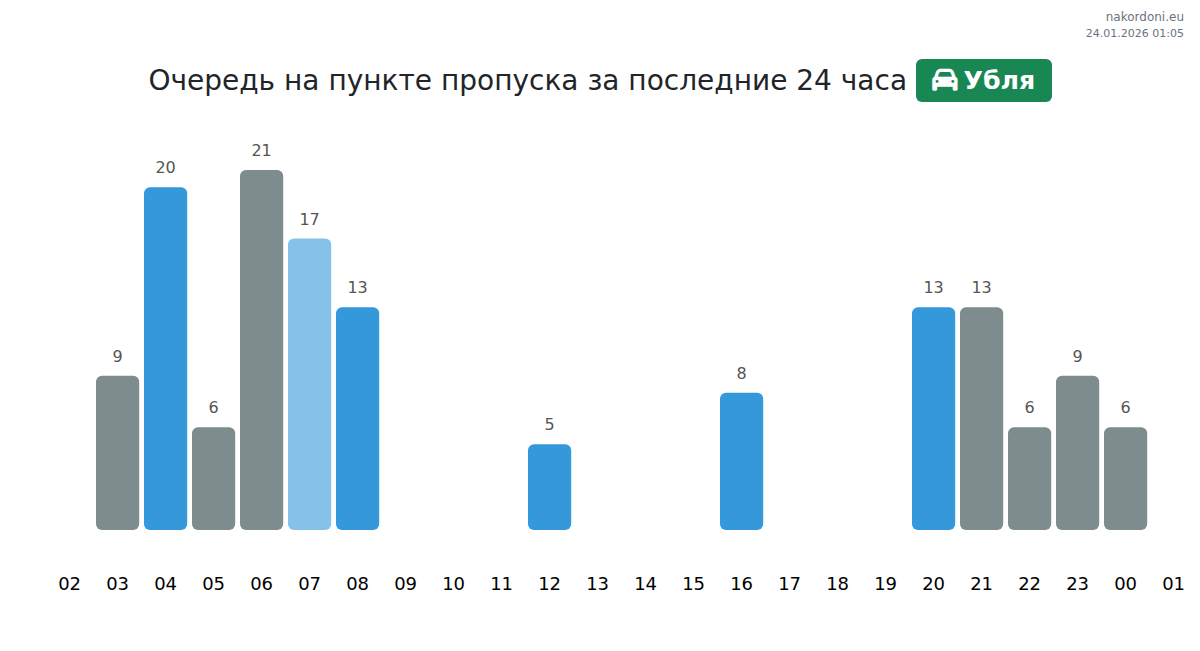 На КПП Убля время ожидания для легковых автомобилей составляет 15-75 минут. Избегайте часов пик: 23:00, 19:00 и 06:00 для более быстрого пересечения. Лучшее время для проезда – 20:00, 21:00 или 00:00.