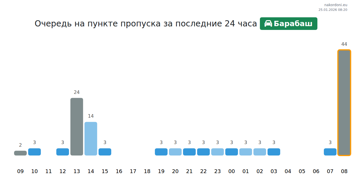 На пункте Барабаш ожидайте время ожидания от 15 до 135 минут. Чтобы минимизировать задержки, избегайте часов пик: 08:00, 10:00 и 16:00. Лучшее время для пересечения: 14:00, 15:00 и 17:00.