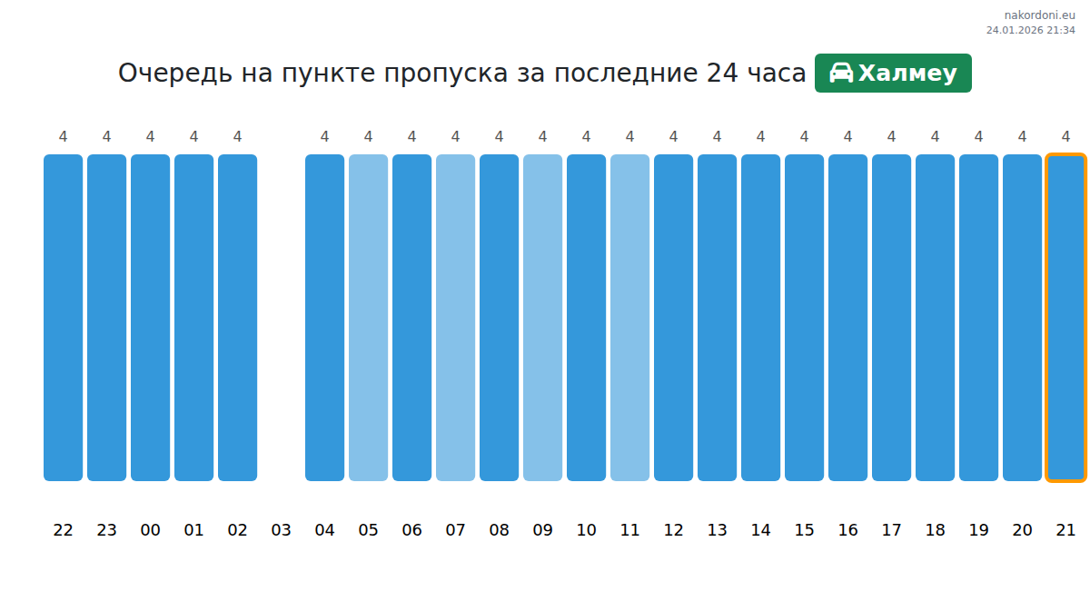 На пункте пропуска Халмеу ожидайте время ожидания от 15 до 495 минут. Избегайте пиковых часов в 13:00, 09:00 и 17:00. Лучшее время для пересечения границы – 14:00, 15:00 и 16:00.