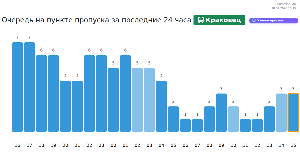 На пункте Краковец время ожидания автобусов прогнозируется от 15 до 420 минут. Избегайте пиковых часов: 01:00, 02:00 и 03:00. Лучшее время для пересечения: 05:00, 09:00 или 12:00.