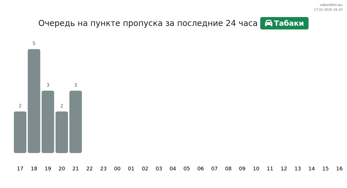 На КПП Табаки для легковых автомобилей прогнозируется ожидание 15-39 минут. Избегайте пиковых часов: 12:00, 13:00, 07:00. Наилучшее время для пересечения – 20:00, 21:00, 23:00.