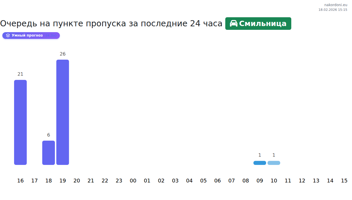 На Смильнице ожидаемое время ожидания для легковых автомобилей составит от 15 до 189 минут. Избегайте пиковых часов: 17:00, 11:00 и 08:00. Для более коротких очередей, пересекайте границу в 15:00, 18:00 или 21:00.