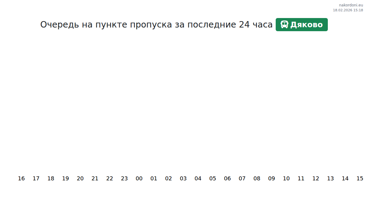 На пункте пропуска Дяково время ожидания для автобусов прогнозируется от 15 до 495 минут. Избегайте пиковых часов: 12:00, 13:00, 20:00. Лучшее время для пересечения: 14:00-16:00, для более коротких очередей.