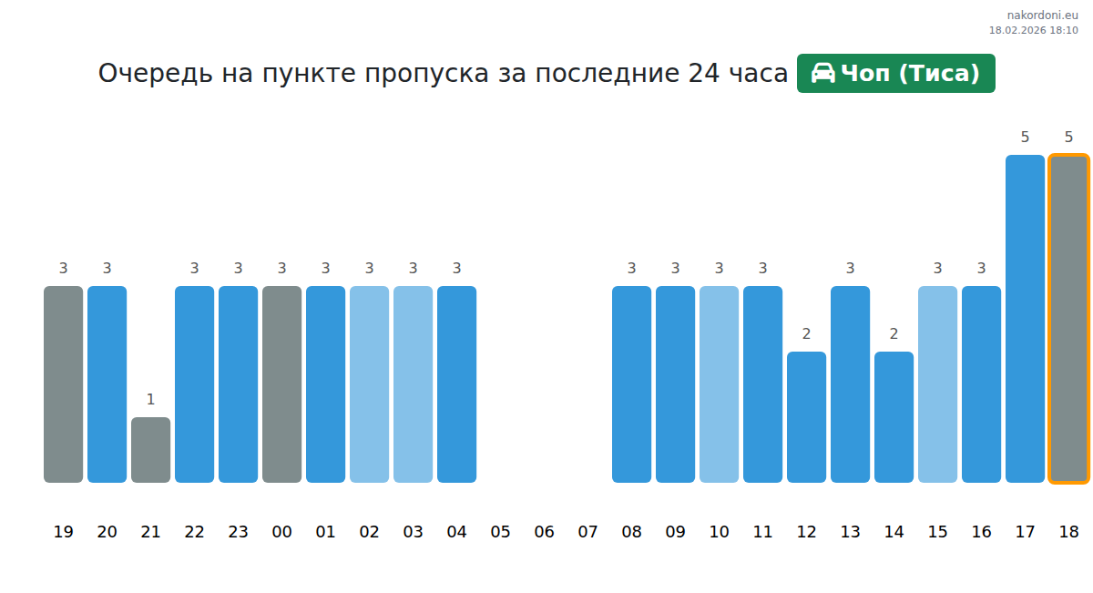 Для Чоп (Тиса) ожидайте время ожидания от 15 до 291 минуты. Избегайте пиковых часов в 01:00, 02:00 и 14:00. Лучшее время для пересечения – 23:00, 03:00 или 04:00, чтобы избежать длинных очередей.