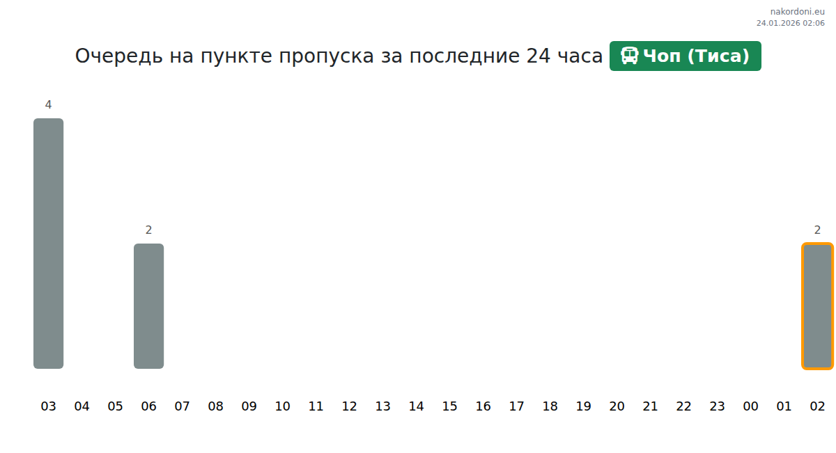 Чтобы избежать длинных очередей на границе на пункте пропуска Чоп (Тиса) - автобус, рекомендуем планировать пересечение границы в часы наименьшей нагрузки. Согласно данным за прошлые сутки, наименьшее количество автомобилей наблюдалось между 1:00 и 4:00 часами. Это идеальное время для пересечения границы, чтобы сэкономить время и избежать задержек.