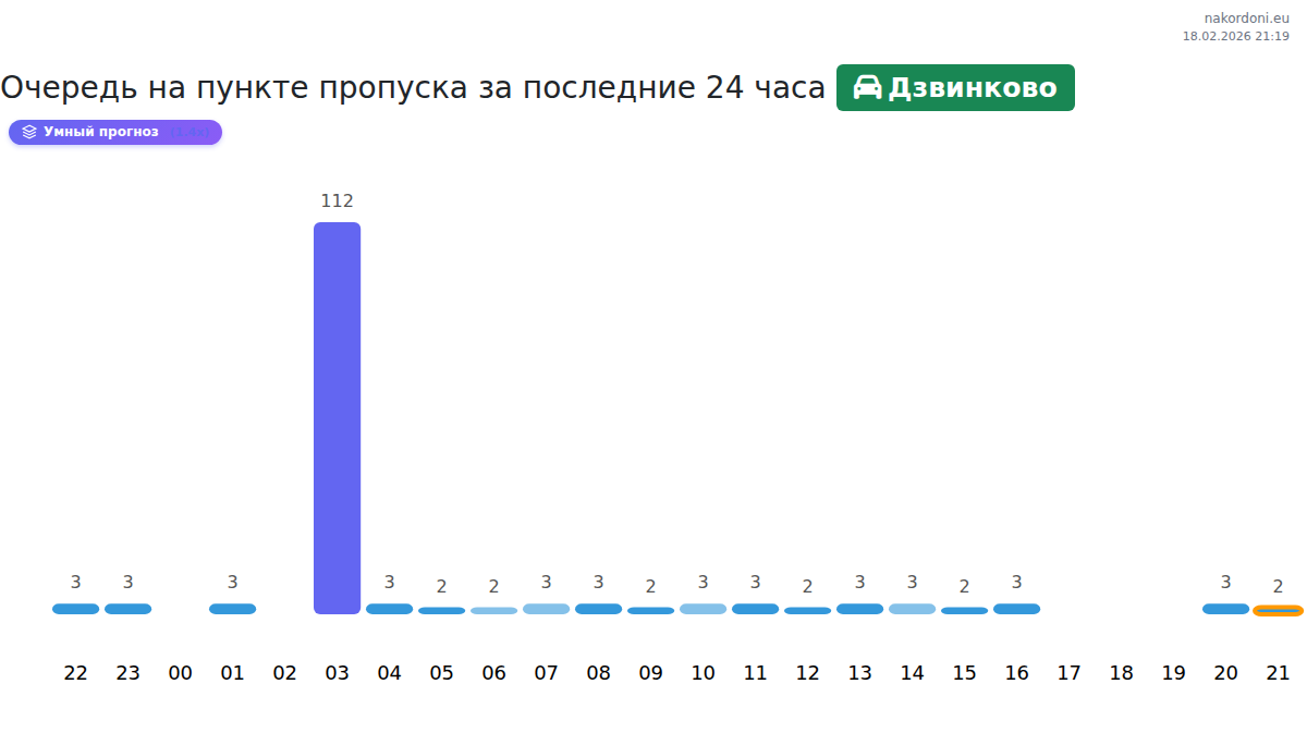 Чтобы избежать длинных очередей на границе на пункте пропуска Дзвинково - легковой автомобиль, рекомендуем планировать пересечение границы в часы наименьшей нагрузки. Согласно данным за прошлые сутки, наименьшее количество автомобилей наблюдалось между 5:00 и 18:00 часами. Это идеальное время для пересечения границы, чтобы сэкономить время и избежать задержек.