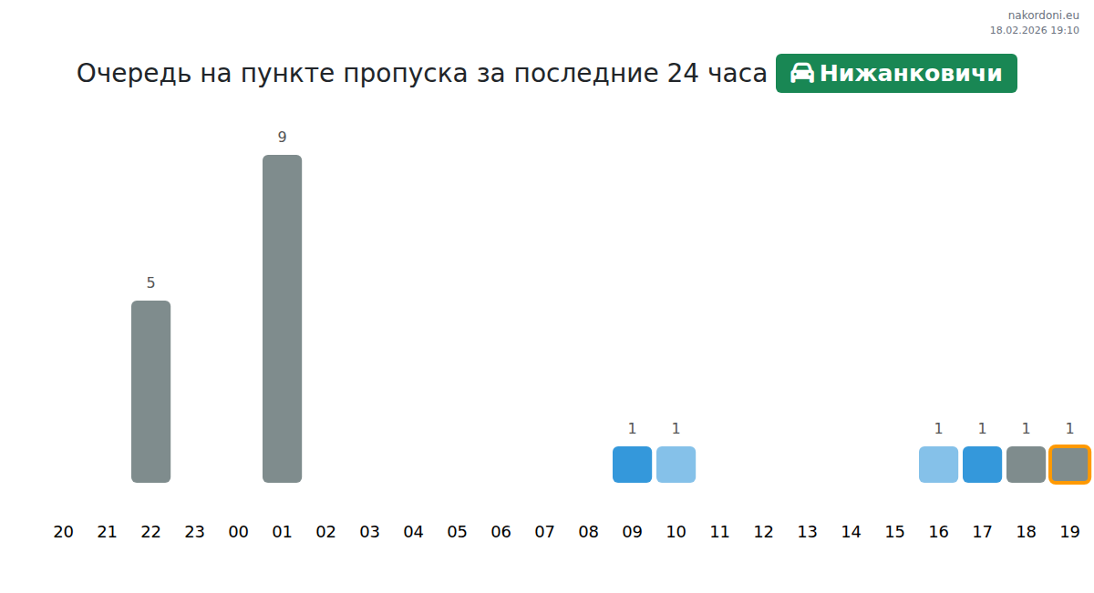 На КПП Нижанковичи время ожидания для легковых автомобилей составит 15-85 минут. Избегайте пересечения в часы пик: 08:00, 01:00 и 23:00. Кратчайшие очереди обычно в 15:00, 18:00 и 21:00.