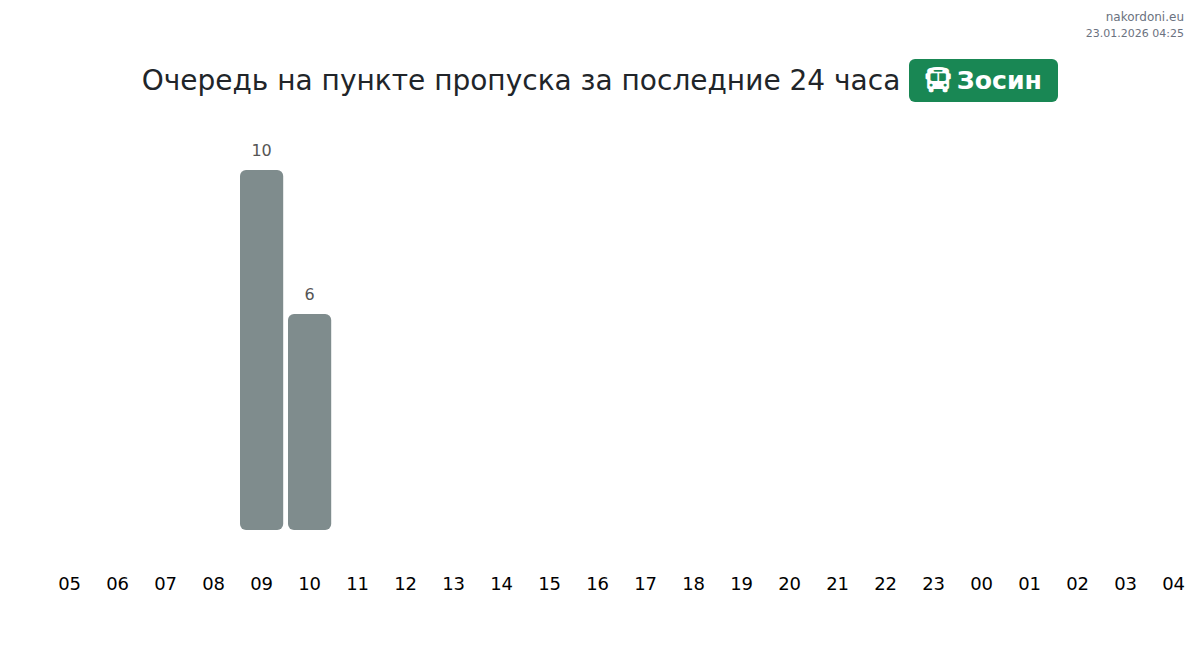На пункте Зосин время ожидания для автобусов составляет от 15 до 2015 минут. Избегайте пересечения в 14:00, 08:00 и 00:00 из-за пиковых часов. Для сокращения очередей рекомендуется пересекать в 16:00, 17:00 или 05:00.