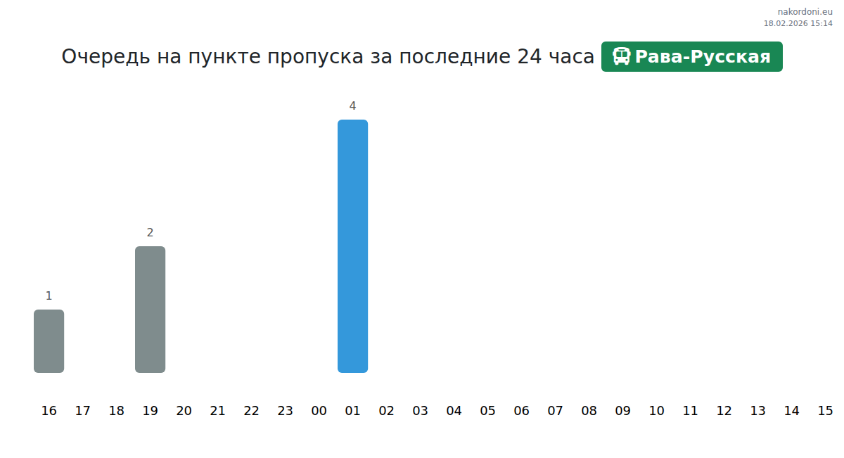 На пункте Рава-Русская для автобусов время ожидания составляет от 15 до 1055 минут. Избегайте пиковых часов: 13:00, 02:00, 04:00. Лучшее время для пересечения: 15:00, 18:00, 21:00.