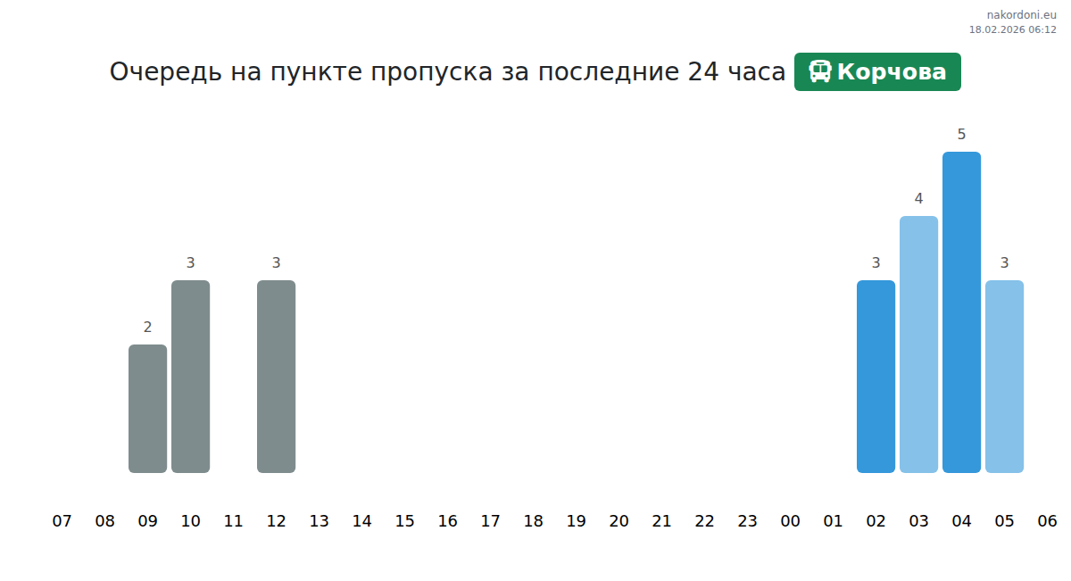 На пункте Корчова для автобусов прогнозируется время ожидания от 15 до 415 минут. Избегайте пиковых часов в 00:00, 02:00 и 07:00. Лучшее время для пересечения – 17:00, 15:00 и 16:00 для коротких очередей.