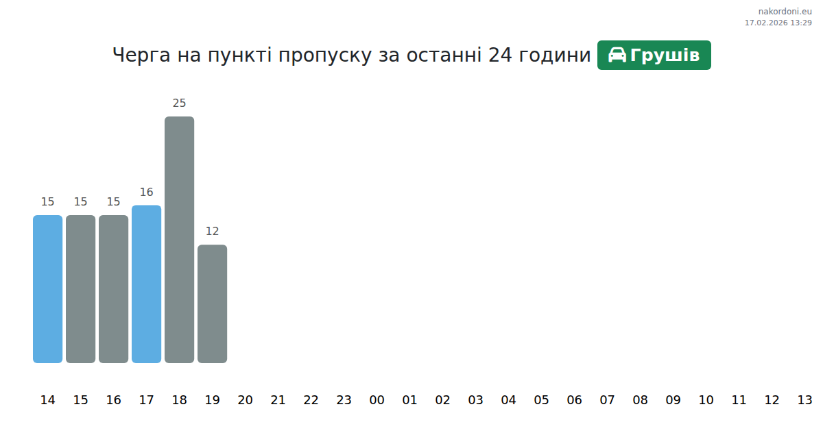 На Грушеві очікуйте час очікування 15-3535 хвилин. Щоб уникнути довгих черг, уникайте 05:00, 03:00 та 01:00. Найкращий час для перетину Грушева: 15:00, 18:00 та 20:00.