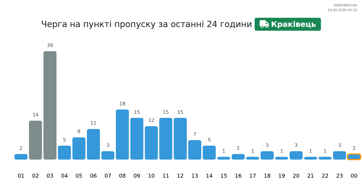 Для уникнення довгих черг на кордоні на пункті пропуску Краківець - авто, рекомендуємо планувати перетин кордону в години найменшого навантаження. Згідно з даними за минулу добу, найменша кількість автомобілів спостерігалася між 7:00 та 15:00 годинами. Це ідеальний час для перетину кордону, щоб зекономити час і уникнути затримок.