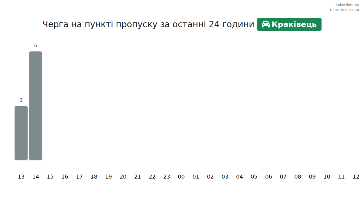 На Краківці очікується час очікування для легкових авто від 15 до 1015 хвилин, в середньому 133 хвилини. Уникайте пікових годин: 20:00, 18:00, 23:00. Найкоротші черги о 14:00-16:00.