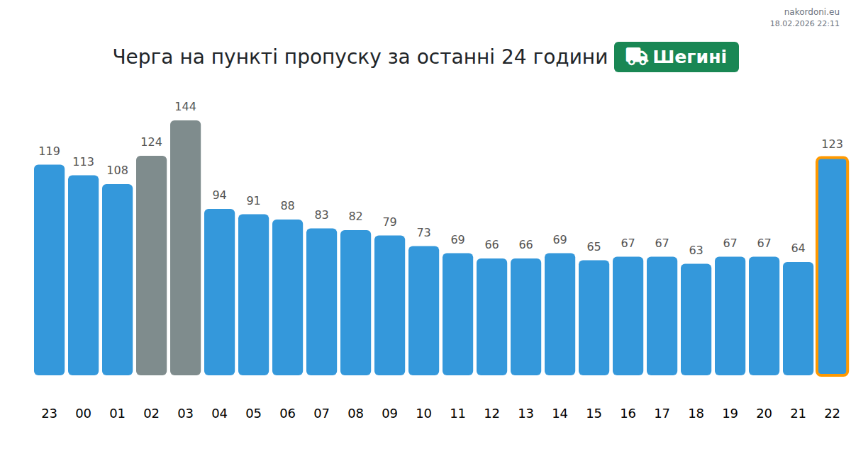 На пункті пропуску Шегині очікується час очікування для транспортних засобів від 15 до 939 хвилин. Уникайте пікових годин з 11:00 до 13:00 для швидшого перетину. Найкращий час для перетину кордону – 02:00, 03:00 або 06:00.