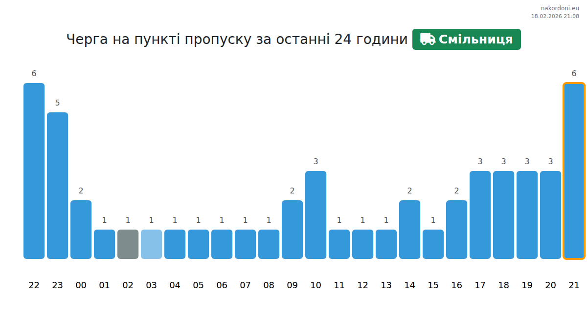 На Смільниці час очікування для вантажівок коливається від 15 до 135 хвилин. Щоб уникнути довгих черг, краще не перетинати кордон у години пік, особливо о 21:00, 23:00 та 22:00. Для коротших затримок рекомендуємо перетинати кордон близько 02:00, 03:00 або 07:00.