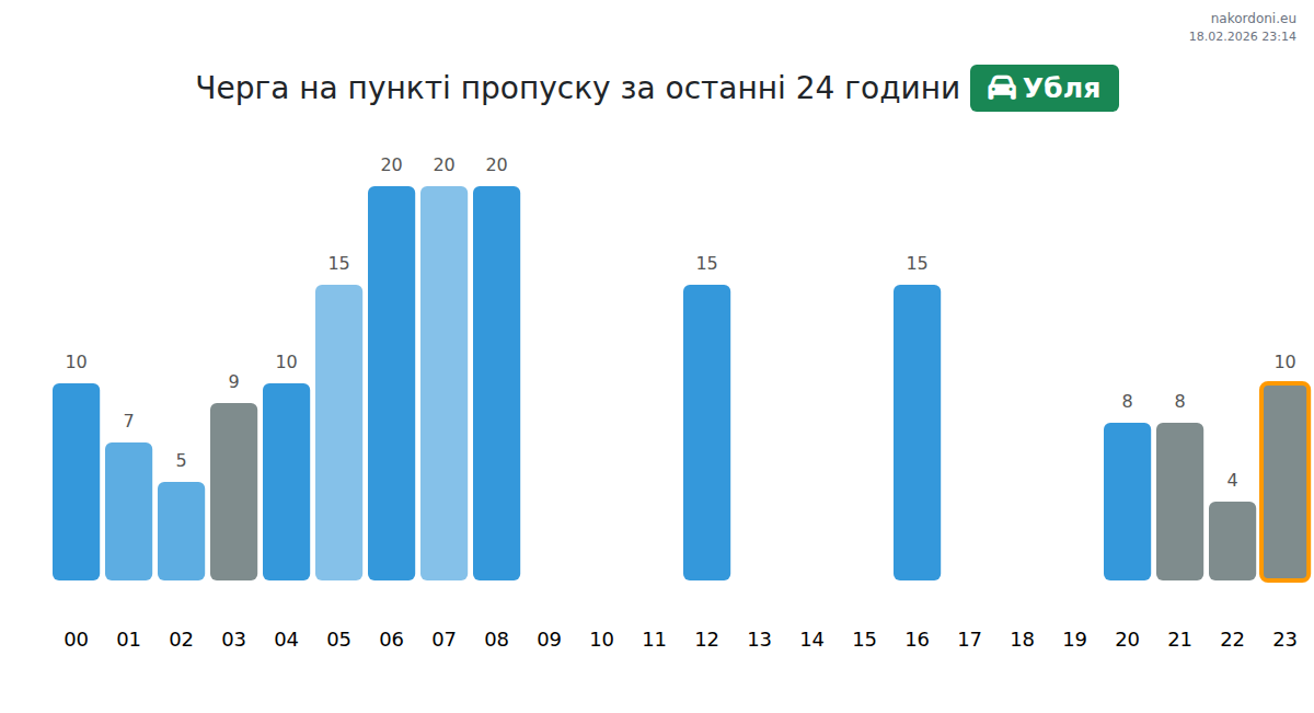 На КПП Убля час очікування для легкових автомобілів становить 15-75 хвилин. Щоб уникнути довгих черг, оминайте години пік: 23:00, 19:00 та 06:00. Найкращий час для перетину – 20:00, 21:00 або 00:00.