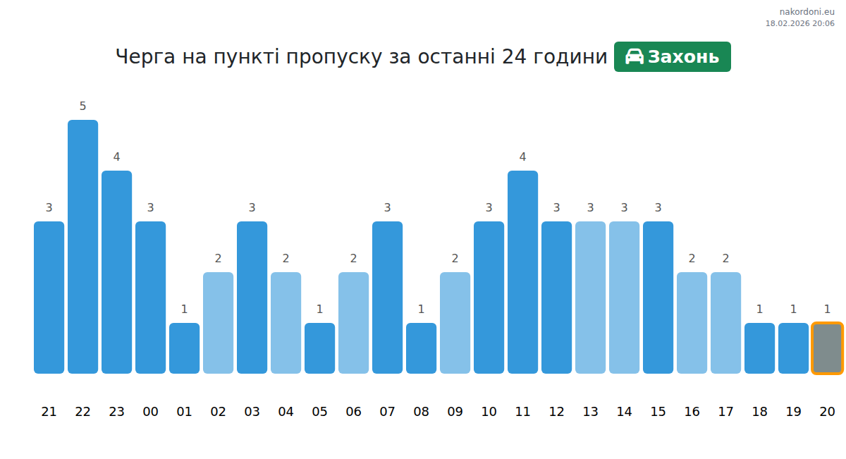 Очікування на Захоні для легкових автомобілів становить 21-33 хвилини. Уникайте пікових годин о 10:00, 12:00 та 11:00. Найкращий час для перетину — 13:00, 14:00 та 15:00.