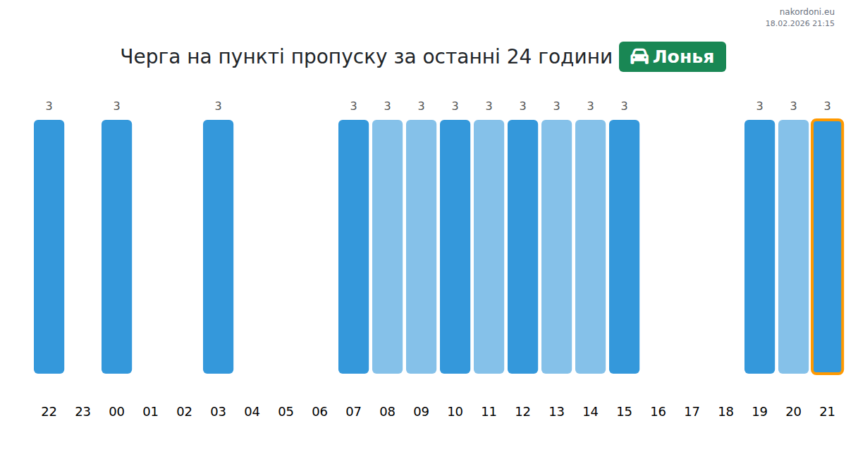 Для уникнення довгих черг на кордоні на пункті пропуску Лонья - авто, рекомендуємо планувати перетин кордону в години найменшого навантаження. Згідно з даними за минулу добу, найменша кількість автомобілів спостерігалася між 1:00 та 4:00 годинами. Це ідеальний час для перетину кордону, щоб зекономити час і уникнути затримок.