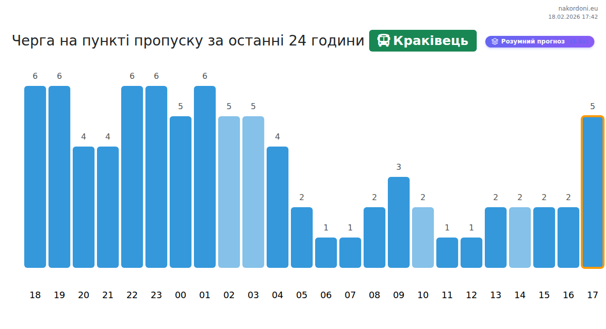 За період 17.02.2026 з 00:00 по 23:59 на кордоні на пункті пропуску Краківець - авто були зафіксовані наступні ключові моменти: