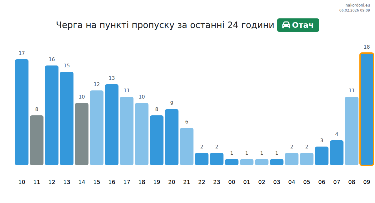На пункті пропуску Отач очікуйте час очікування для легкових автомобілів від 33 до 117 хвилин. Уникайте пікових годин о 12:00, 10:00 та 07:00. Найкоротші черги прогнозуються з 22:00 до 00:00, що є найкращим часом для перетину.