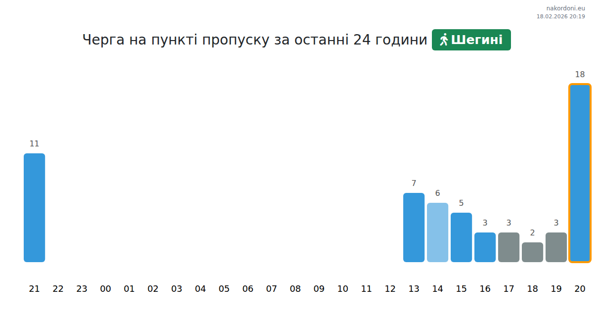 На Шегині час очікування для ТЗ прогнозується 15-96 хвилин. Уникайте пікових годин (08:00, 10:00, 06:00). Найменші черги очікуються о 15:00, 18:00 або 20:00.