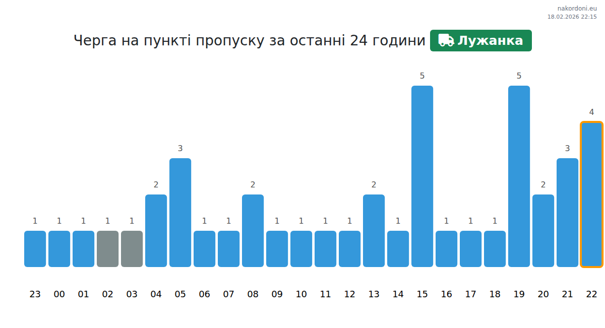 На Лужанці прогнозується час очікування для транспортних засобів від 15 до 135 хвилин. Уникайте годин пік: 11:00, 12:00, 13:00. Найкоротші черги очікуються о 02:00, 03:00 та 14:00.