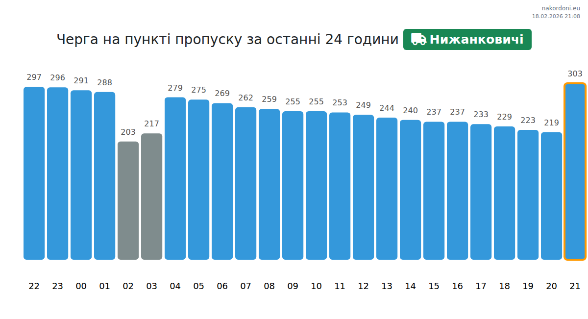 На Нижанковичі, час очікування для транспортних засобів становить від 15 до 2525 хвилин. Уникайте перетину між 04:00, 01:00 та 14:00 через пікові черги. Для коротшого очікування, перетинайте близько 02:00, 03:00 або 06:00.